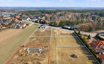 Działka ma bardzo korzystne parametry pod zabudowę. Jej powierzchnia wynosi 11 arów, a szeroki front o wymiarze około 40,8 m daje dużą swobodę zagospodarowania terenu i bardzo dobrze współgra z planowaną zabudową parterową. Kształt działki jest regularny, teren równy i nie wymaga niwelacji. To jedna z tych parceli, które od razu „czytają się” dobrze — i na mapie, i w terenie.