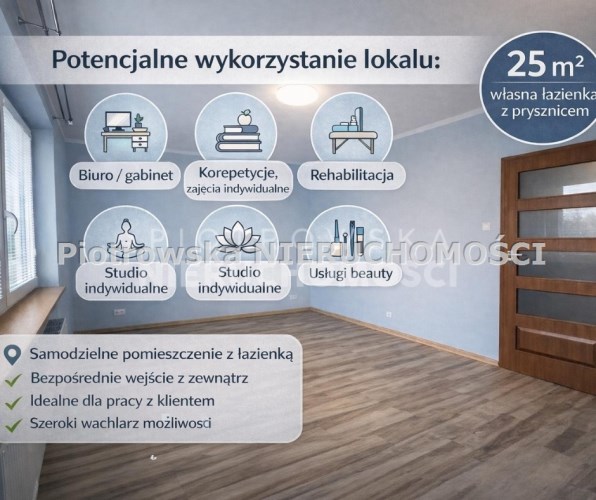Pomieszczenie jest zadbane, gotowe do aranżacji według własnych potrzeb. Wielkość i układ pozwala na komfortową pracę z klientem, prowadzenie spotkań lub działalność indywidualną.
