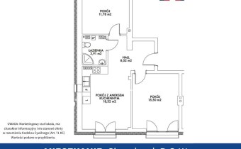 Jeśli szukasz mieszkania „do życia”, a nie do kompromisów — to jest dokładnie ten typ układu. 57,53 m² zaprojektowane tak, żeby każdy metr był użyteczny: dwa niezależne pokoje, dzienna strefa z aneksem i wygodny hall, który aż się prosi o porządną zabudowę.
