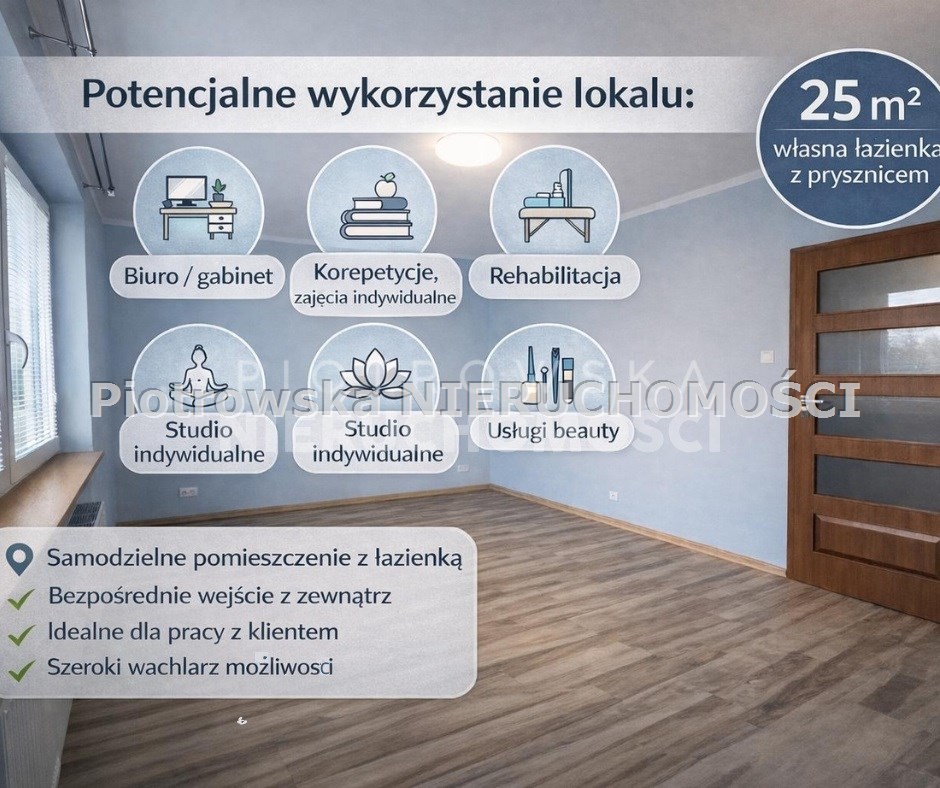 Pomieszczenie jest zadbane, gotowe do aranżacji według własnych potrzeb. Wielkość i układ pozwala na komfortową pracę z klientem, prowadzenie spotkań lub działalność indywidualną.